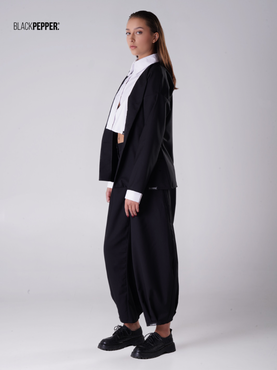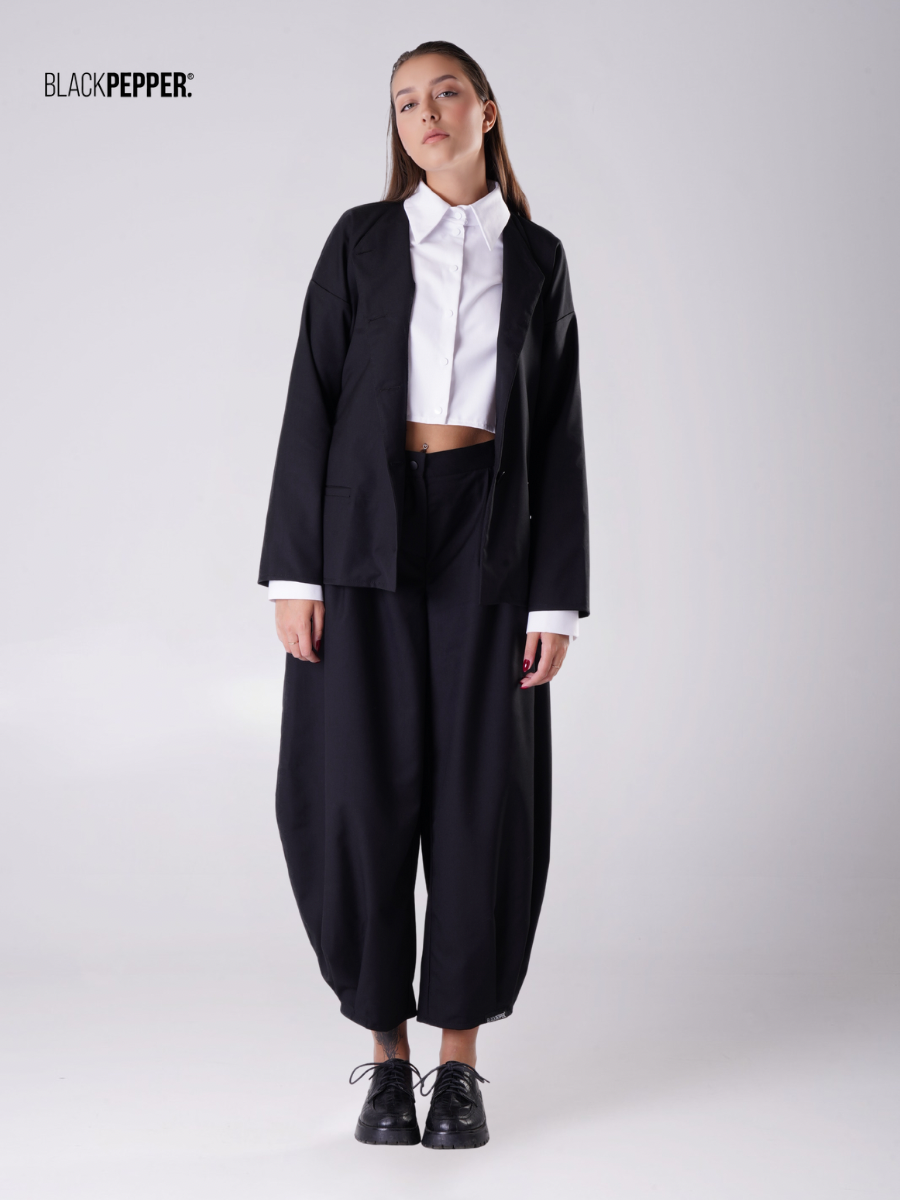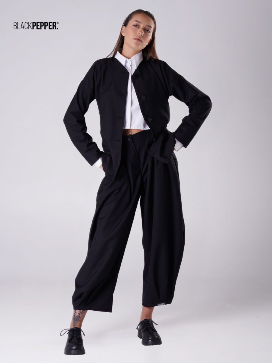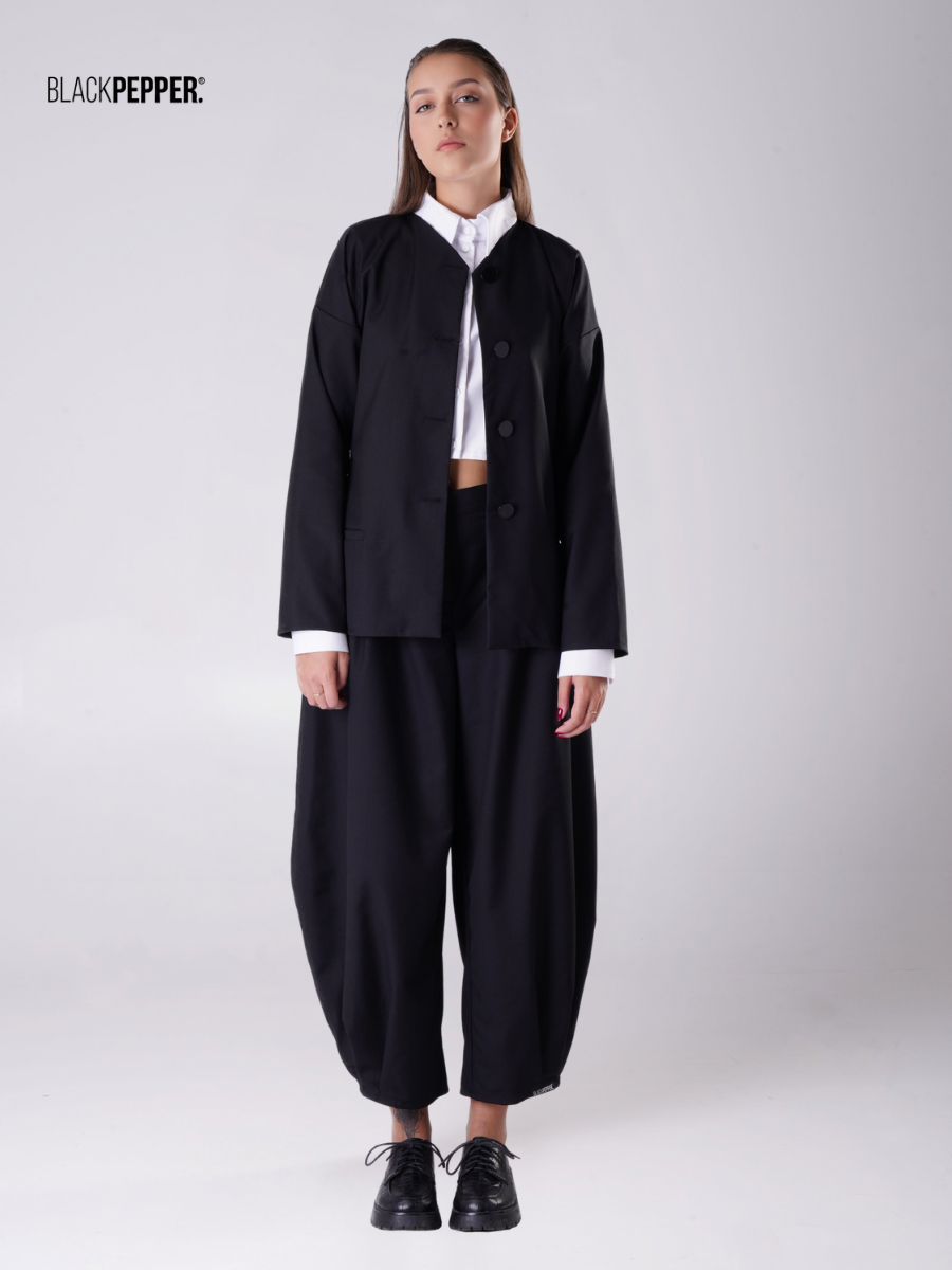 MUGEN Construct ist ein stilvolles und vielseitiges Set, bestehend aus einer Jacke mit geradem Schnitt und locker geschnittenen Hosen. Mit seiner modernen Silhouette und dem bequemen Sitz eignet sich dieses Outfit sowohl für den Alltag als auch für besondere Anlässe.