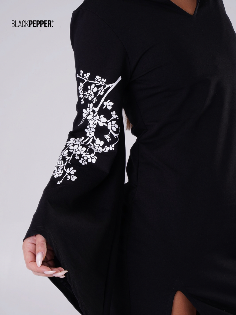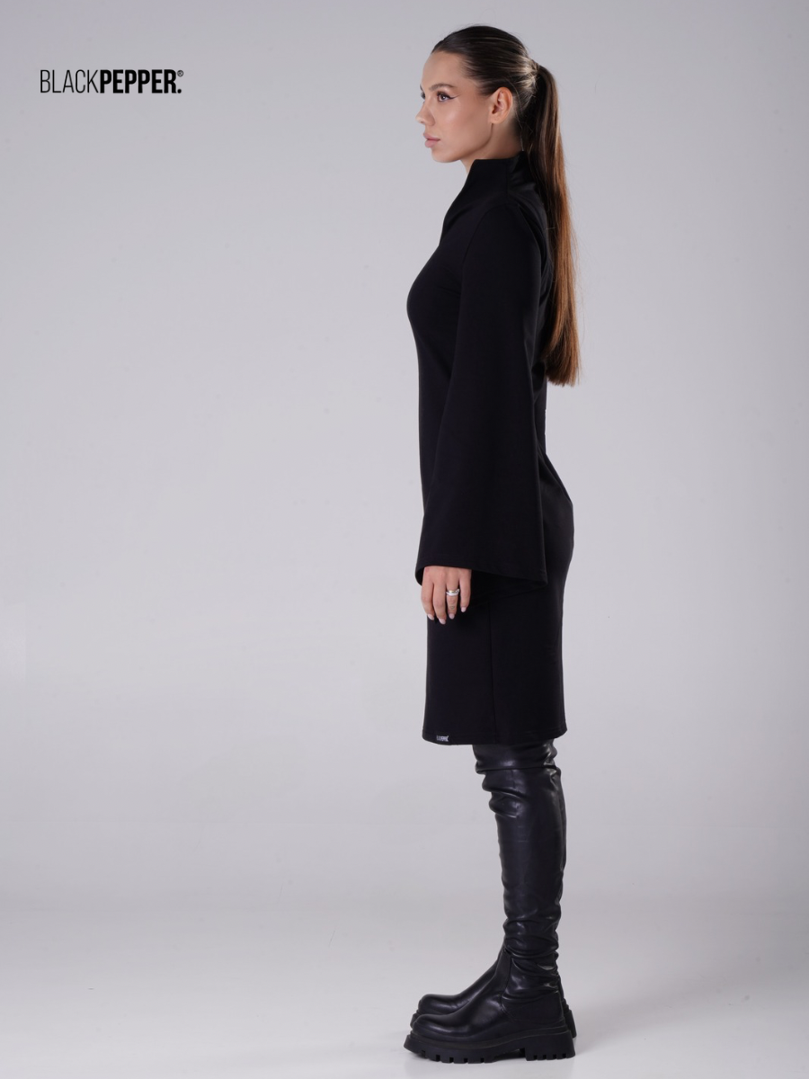 Elegancka czarna sukienka z szerokimi asymetrycznymi rękawami