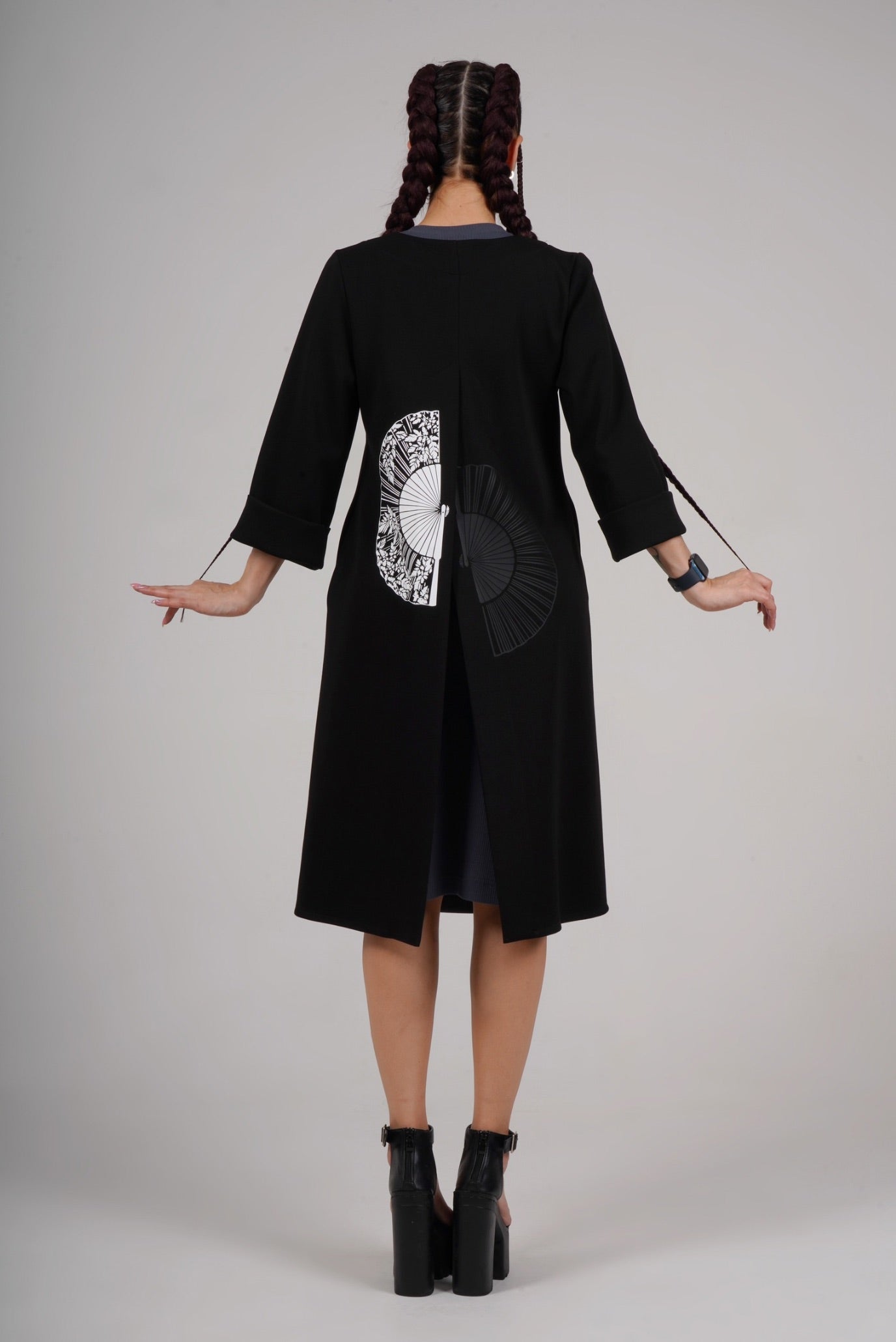 An elongated blazer with a high slit, relaxed silhouette, and deep pockets. The blazer is made from soft, dense luxury knit fabric (premium quality).