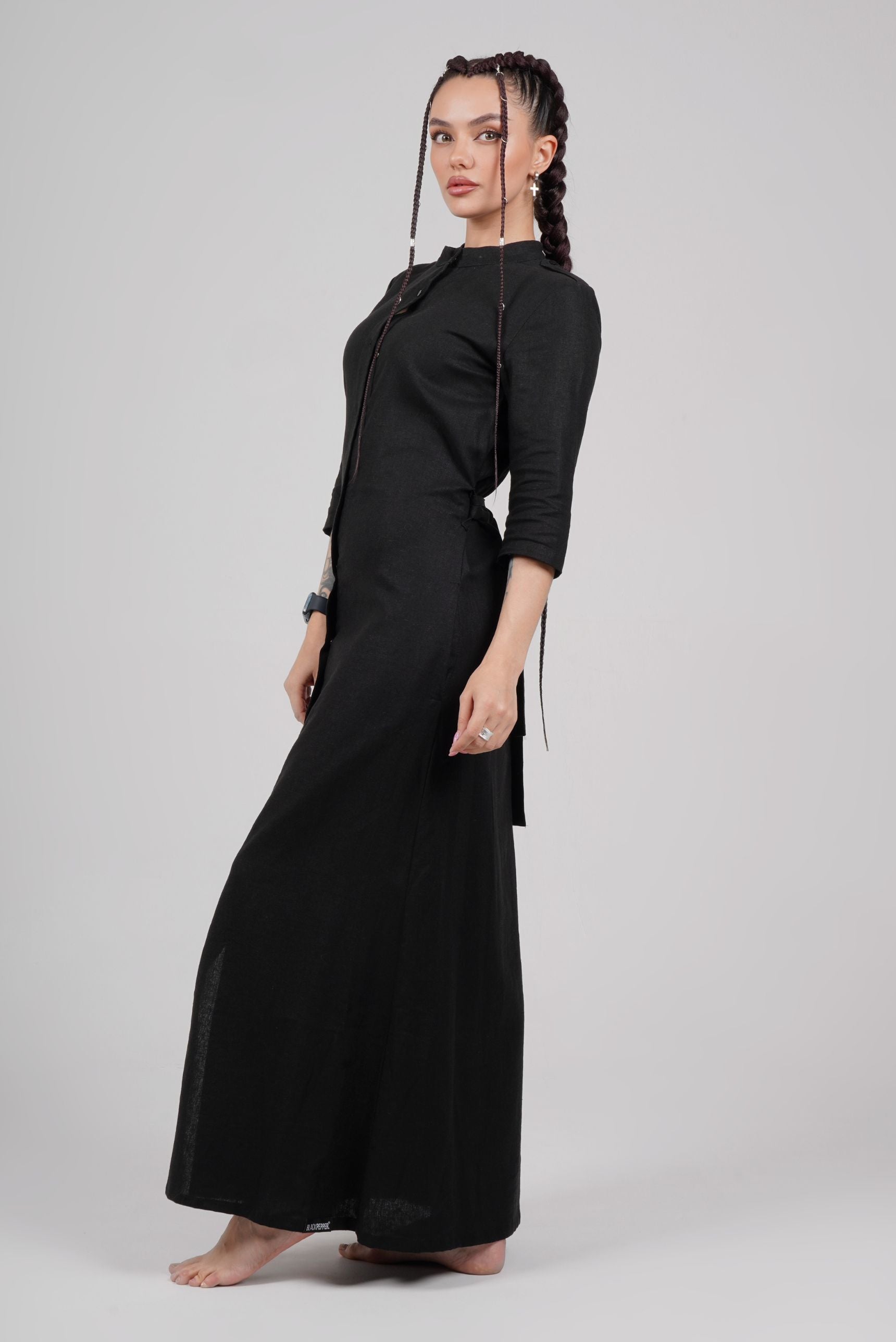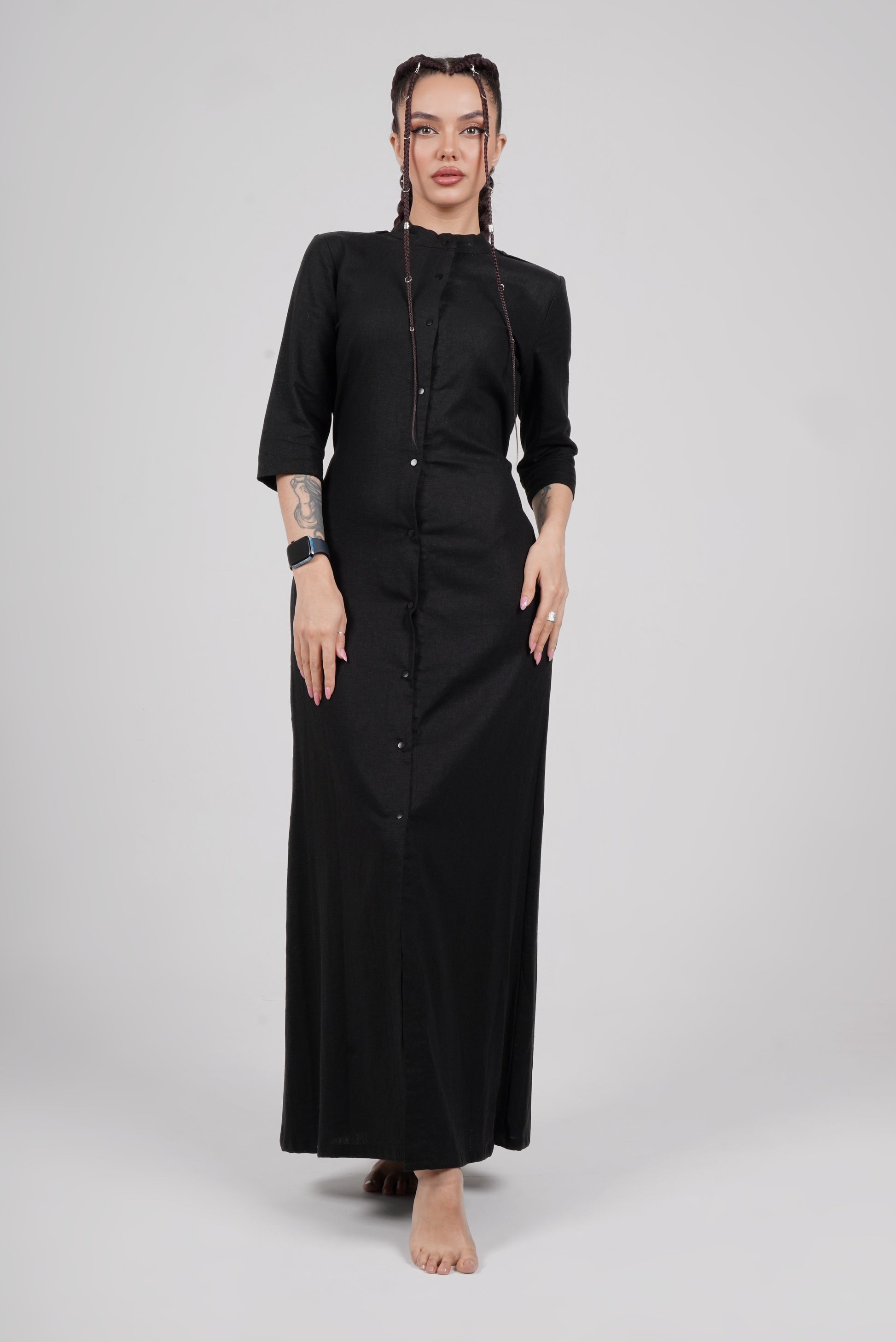 Black maxi dress in military style – made from dense linen fabric, fastened with snap buttons along the entire length.