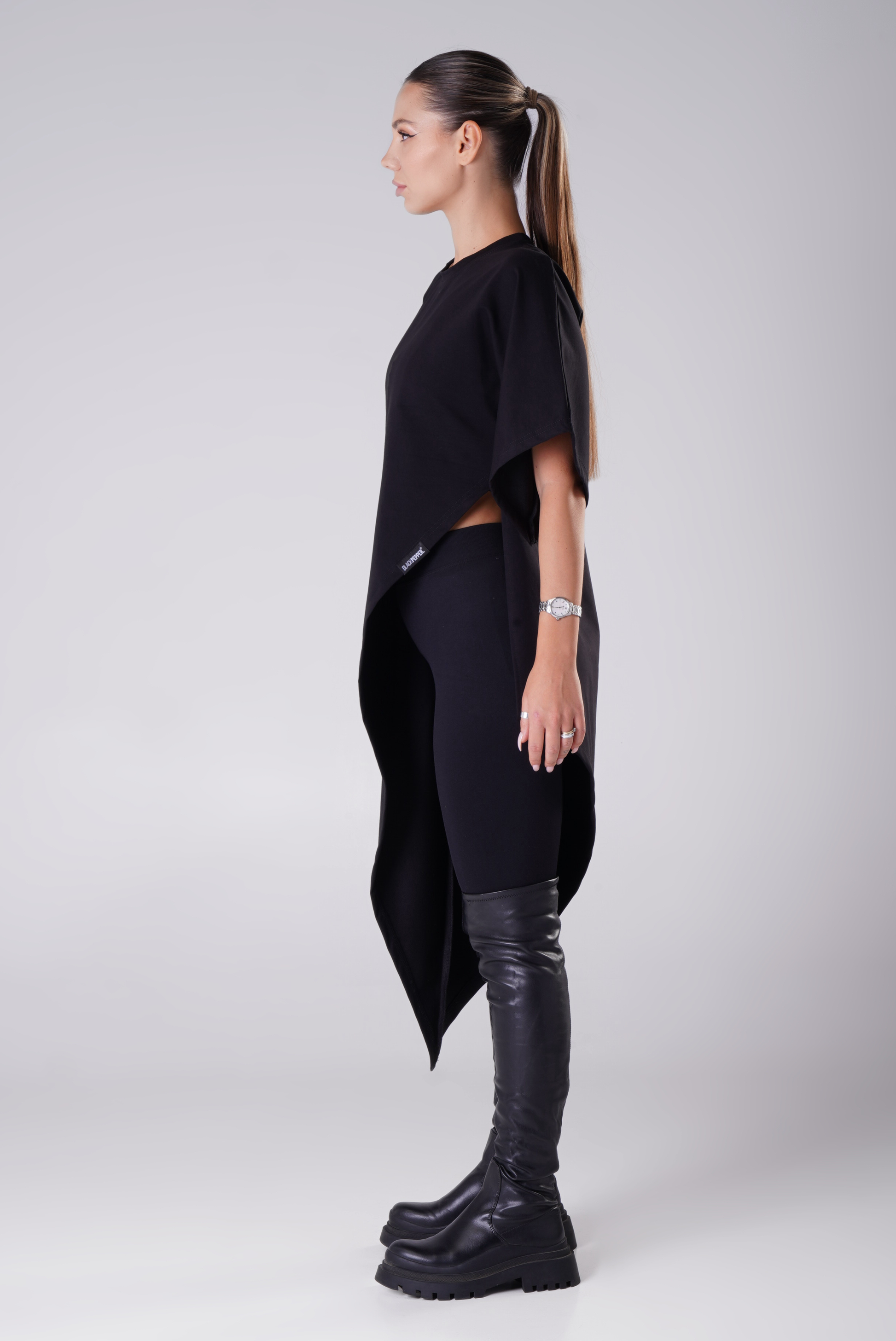 This black tunic is a wardrobe staple with character. Made from dense knit fabric, it holds its shape well and provides comfort throughout the day. The asymmetrical cut adds dynamic movement to the silhouette, while the versatile length allows it to be worn alone or layered—with leggings, trousers, or a skirt.