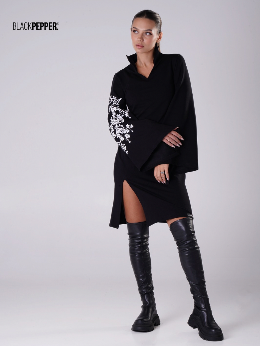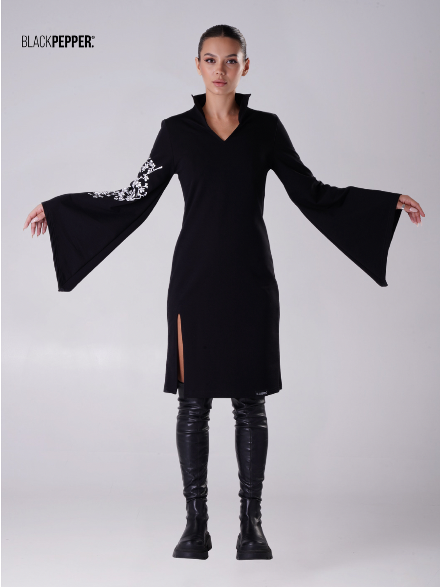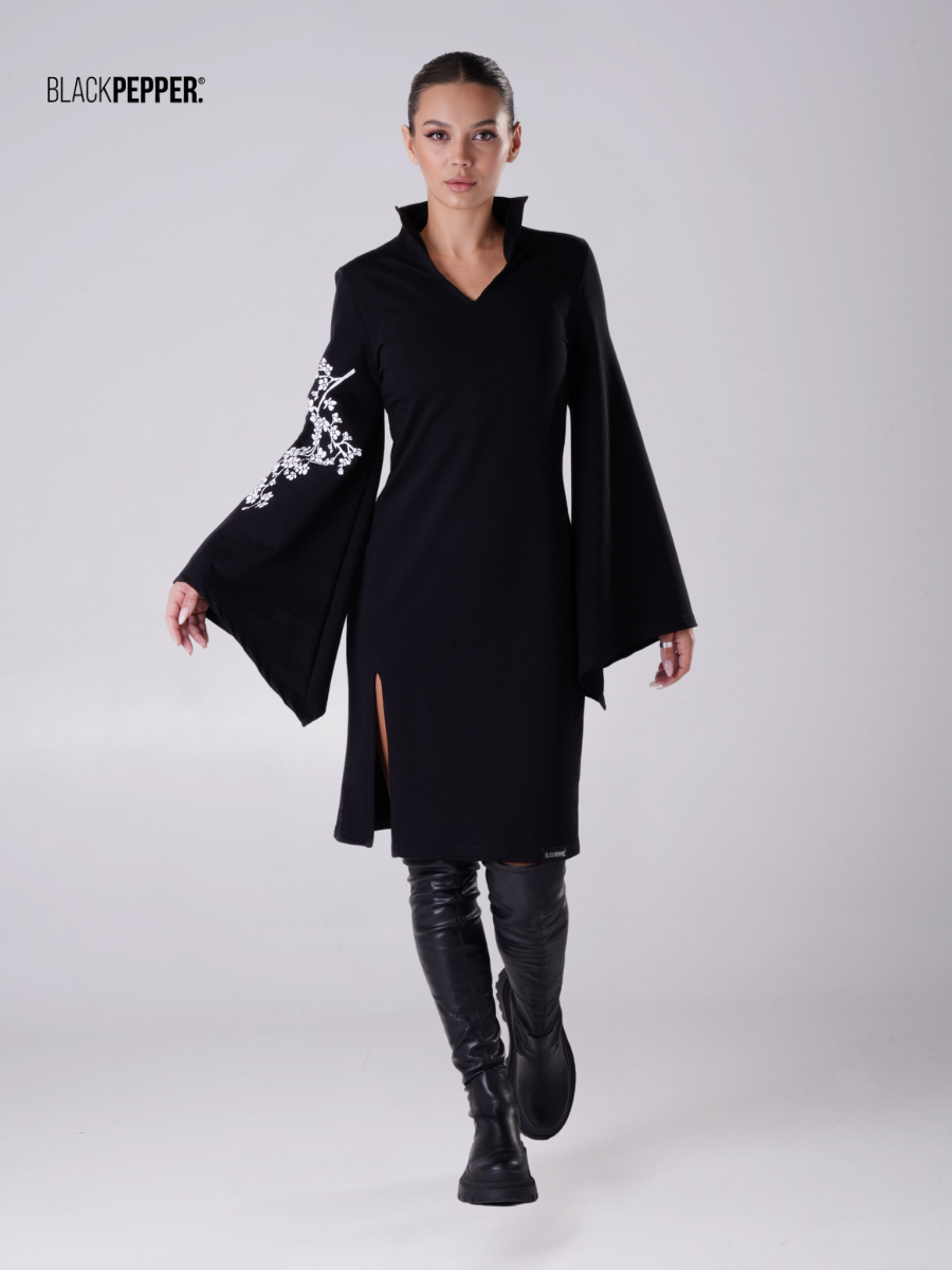 Элегантное чёрное платье с широкими асимметричными рукавами.
