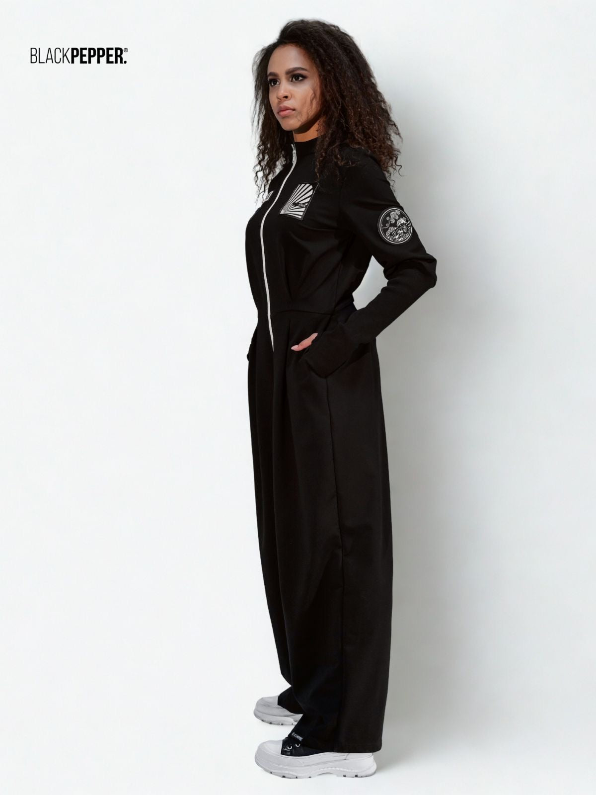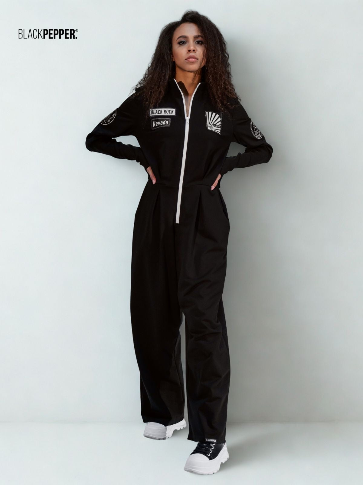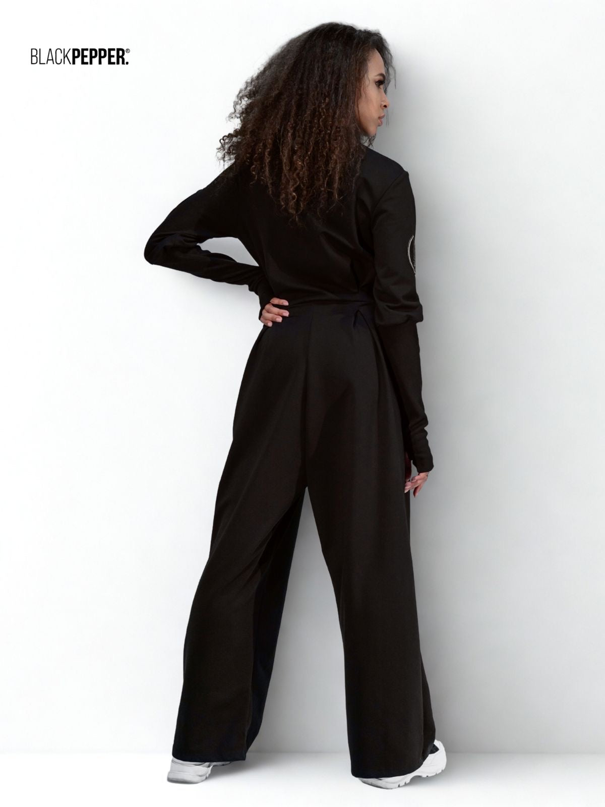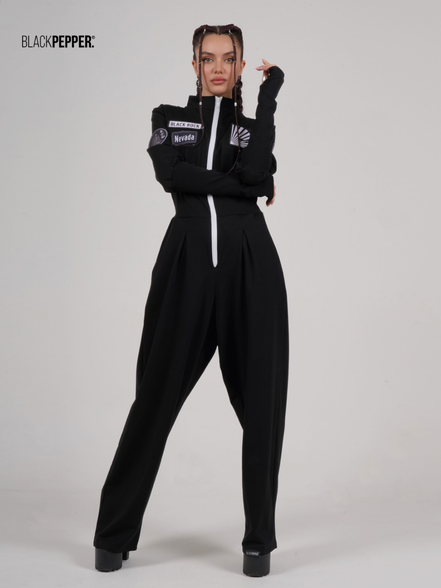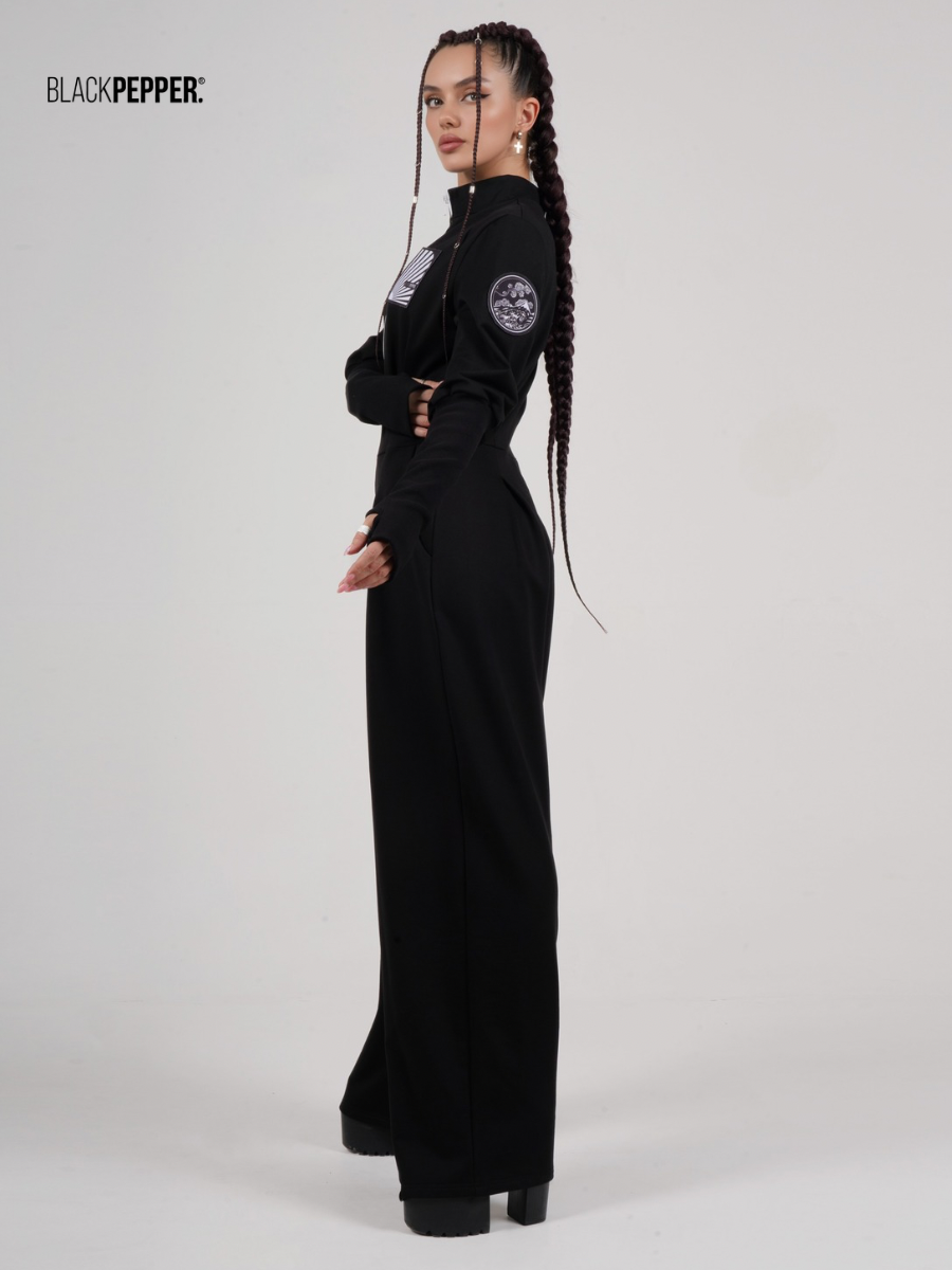 Приталенный силуэт, высокие манжеты и широкие брючины создают выразительный образ.