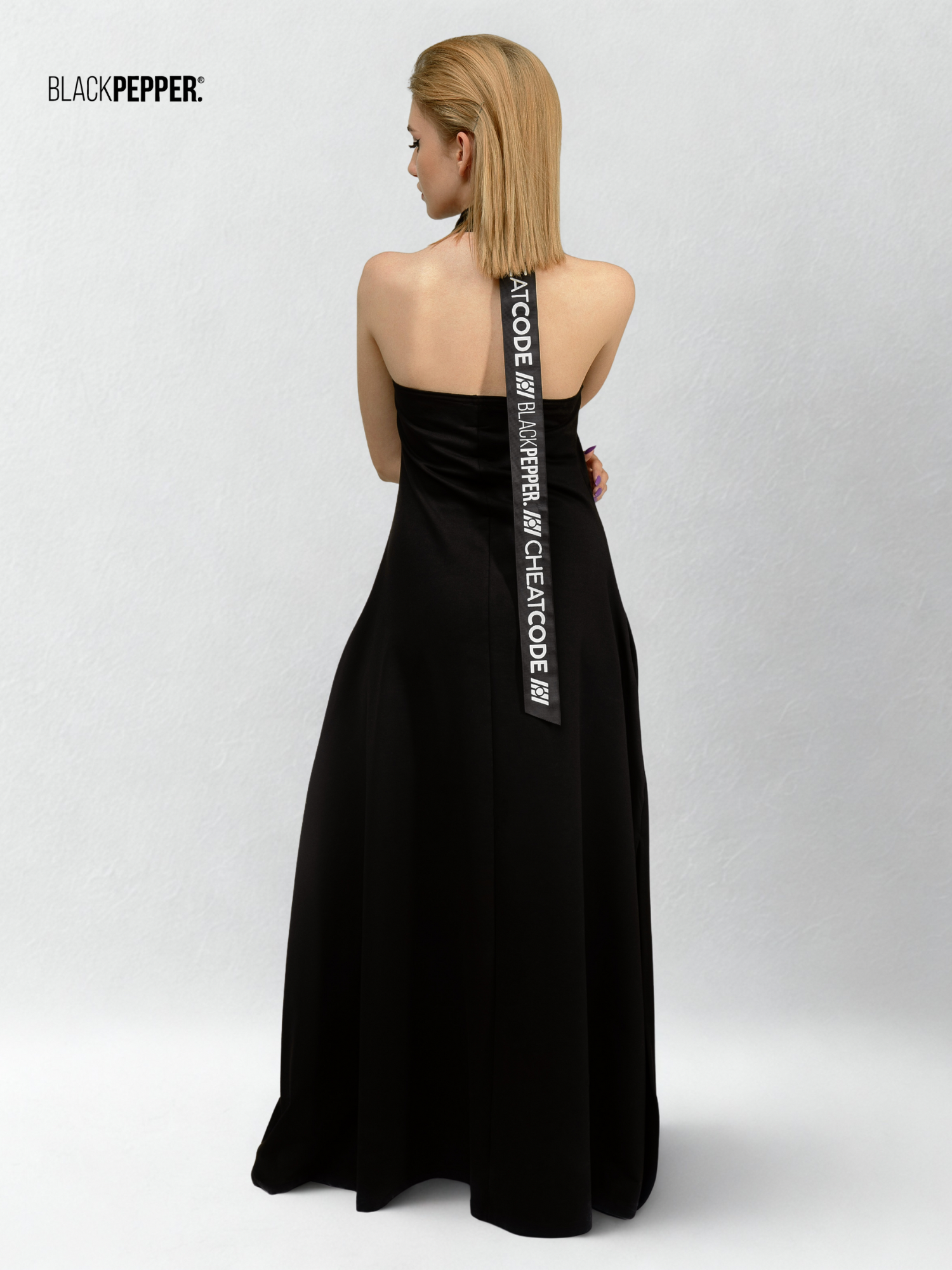 Шикарное макси-платье с открытой спиной и высоким разрезом с одной стороны, фиксирующимся на пуговицы.